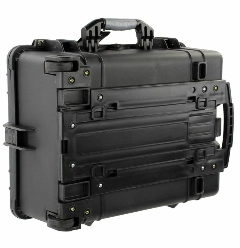 Case features include crushproof low profile roller wheels, retractable pull handle, comfortable rubber grip ergonomic folding carry handles, two pad lock adaptable fittings meets TSA regulations for travel, two press and pull snap latches securing the full length of the case and uniform ridges on the top and bottom creating a stackable design for multi case transport. A waterproof seal is formed when the case is latched closed applying pressure to a rubber gasket that is molded to the perimeter of the case. Fully submerged waterproof protection up to 1 meter. IP67 waterproof, dustproof and shockproof.
