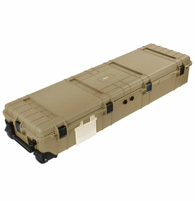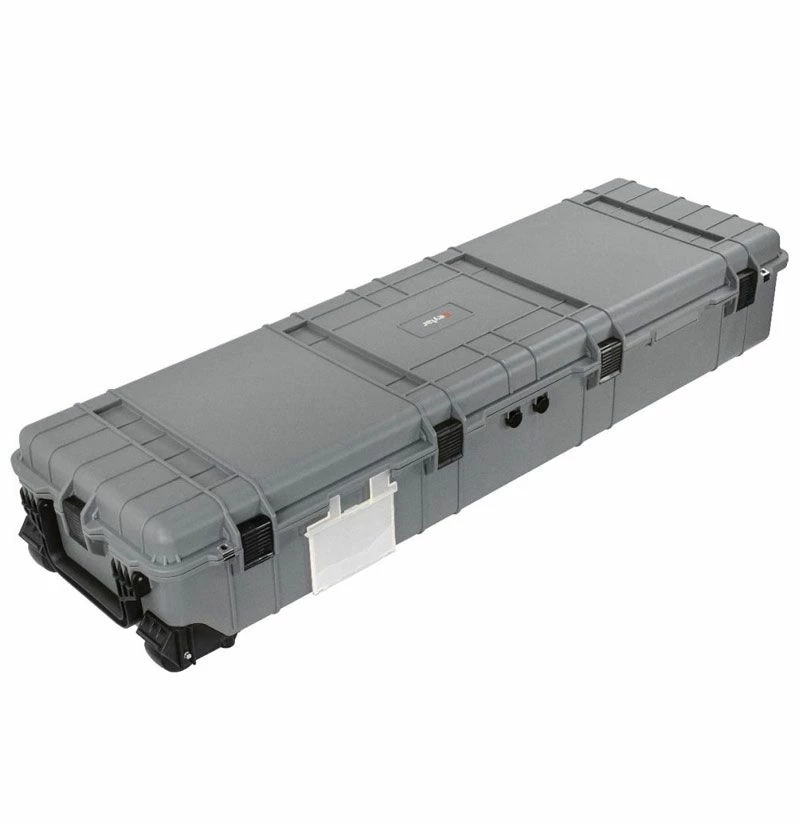 Case features include crushproof low profile roller wheels, tow handle, comfortable side folding carry handles, two pad lock adaptable fittings meets TSA regulations for travel, two press and pull snap latches securing the full length of the case and uniform ridges on the top and bottom creating a stackable design for multi case transport. A waterproof seal is formed when the case is latched closed applying pressure to a rubber gasket that is molded to the perimeter of the case. Fully submerged waterproof protection up to 1 meter. IP67 waterproof, dustproof and shockproof.