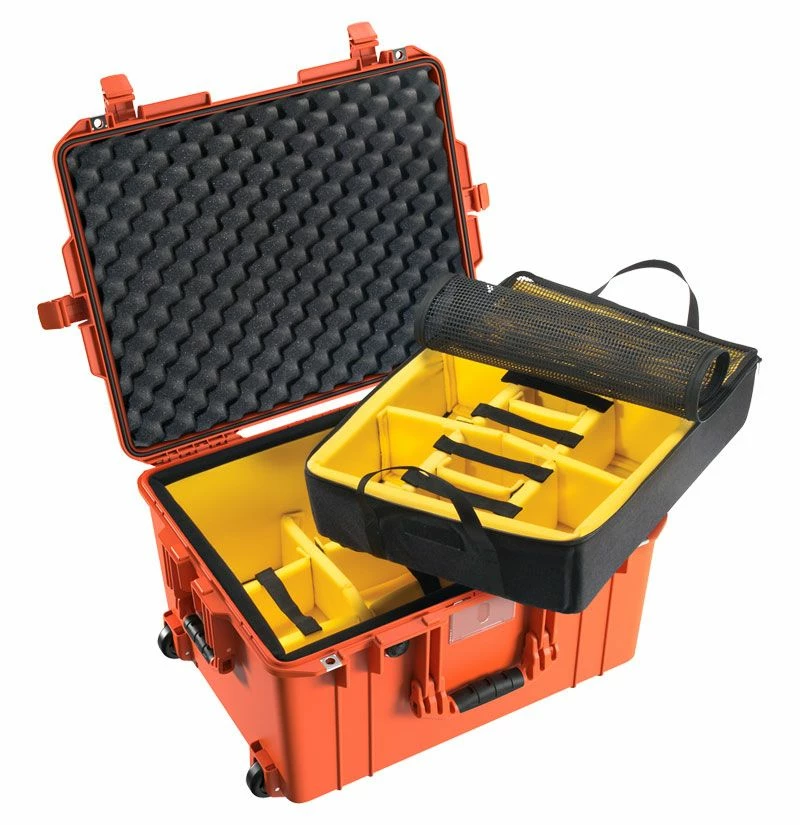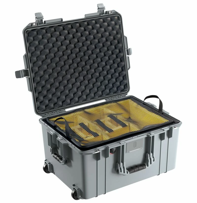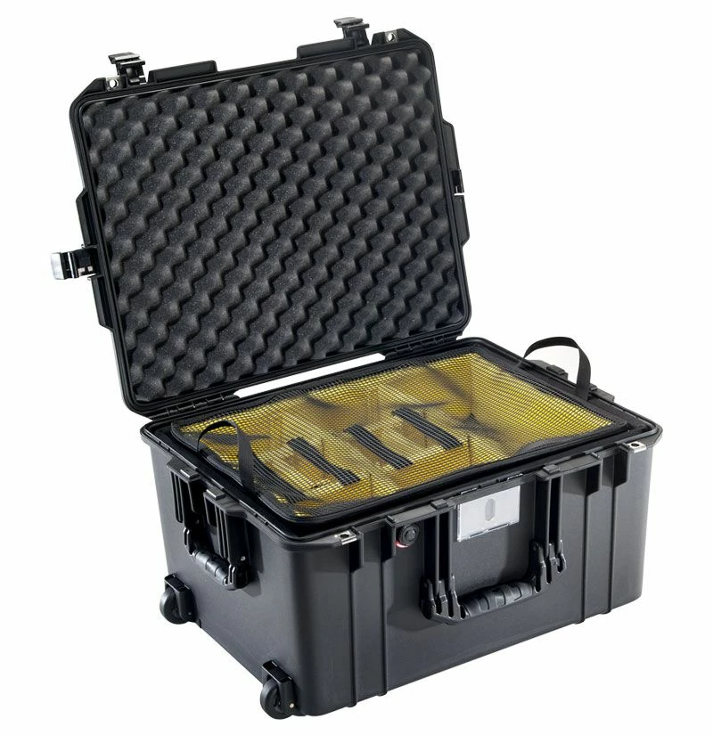 Pelican Air Protector Cases are the lightest Polymer Protector case on the planet. Up to 40% lighter. Guaranteed for life. New, high tech construction is lightweight and tough. Waterproof, dustproof and crushproof. Fully featured, the case has ABS double-throw latches that accept a user-supplied padlock, a watertight O-ring gasket, an automatic purge valve, and stainless steel hasp protectors. Users will appreciate the stylish conic curve lid shape and rubber overmolded handle. And for easier case ID, there’s an attractive and removable polycarbonate card holder that may be placed on the front or side of the case. The 1607 Air Case features quiet rolling wheels and a retractable extension handle for easy transport.