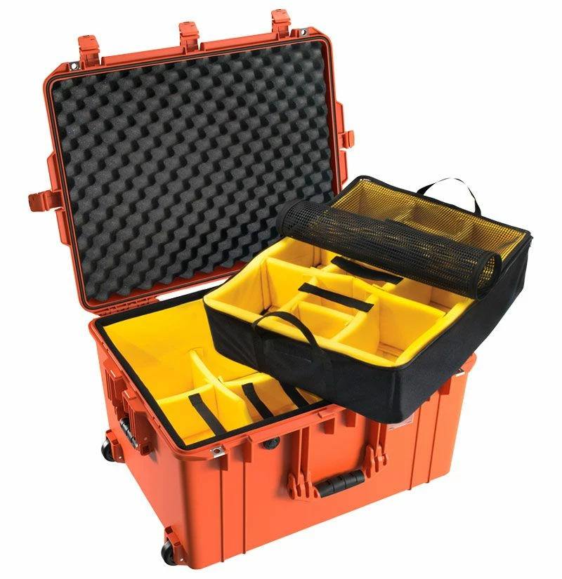 Pelican Air Protector Cases are the lightest Polymer Protector case on the planet. Up to 40% lighter. Guaranteed for life. New, high tech construction is lightweight and tough. Waterproof, dustproof and crushproof. Fully featured, the case has ABS double-throw latches that accept a user-supplied padlock, a watertight O-ring gasket, an automatic purge valve, and stainless steel hasp protectors. Users will appreciate the stylish conic curve lid shape and rubber overmolded handle. And for easier case ID, there’s an attractive and removable polycarbonate card holder that may be placed on the front or side of the case. The 1607 Air Case features quiet rolling wheels and a retractable extension handle for easy transport.