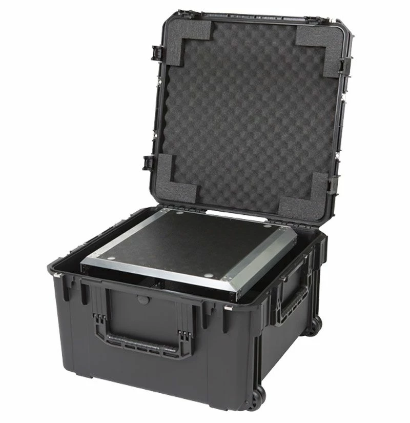 The internal Fly Rack frames are built of high strength, lightweight aluminum alloy and 11 gauge hot rolled carbon steel rack rails just like the Military Grade Shock Racks. The internal frame contains front and rear rack rails with a 19 in. rack depth. ABS plastic covers the top and bottom of the removable shock rack for added protection when the rack is out of the case. The rack frame easily fits into SKB‘s iSeries case that is protected by high quality PE foam that provides space for protruding knobs and buttons. Convenient in-line wheels and push button release pull handle provide easy transport.
