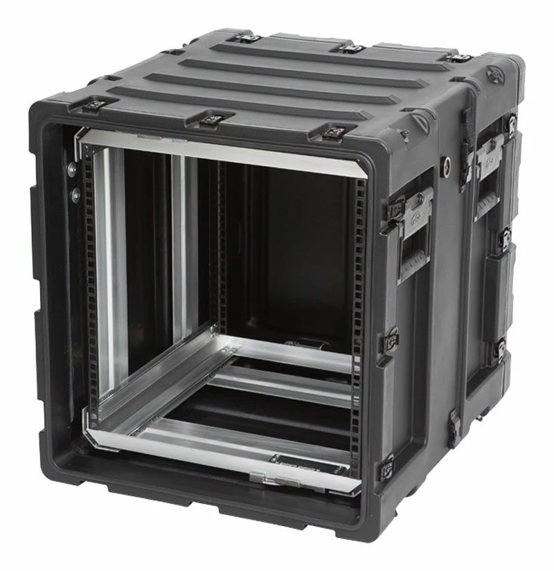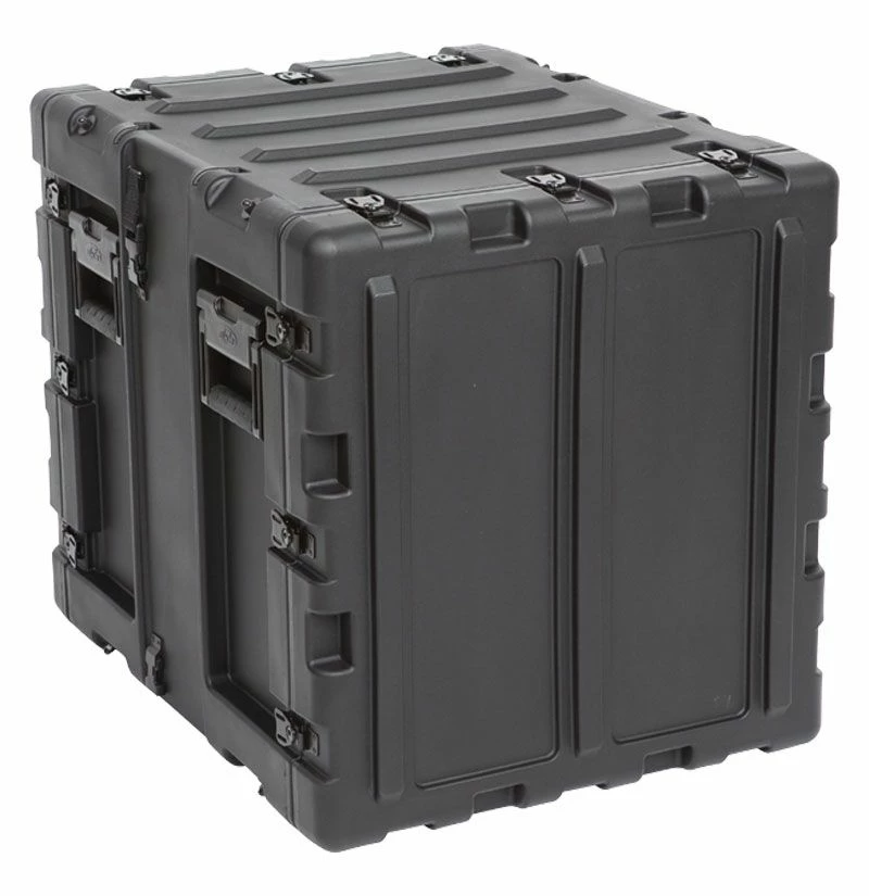 The rugged roto-molded shell ensures industry leading strength and impact resistance. The standard commercial off the shelf (COTS) case comes with 2 in. deep front and rear lids to accommodate rack gear that is longer than 20 inches. Molded-in stacking ribs and lugs are designed to stack with all SKB 3RR and 3RS cases, as well as competitive manufacturer cases, and feature black powder coated stainless steel hardware that is recessed for protection and 4 comfort grip spring loaded lift handles which allow for easy movement. An automatic pressure relief valve is another standard feature along with gasket sealed lids that include convenient lid hangers to store your lids when your equipment is in operation. Coupling straps are included for securing the racks together when stacked.
