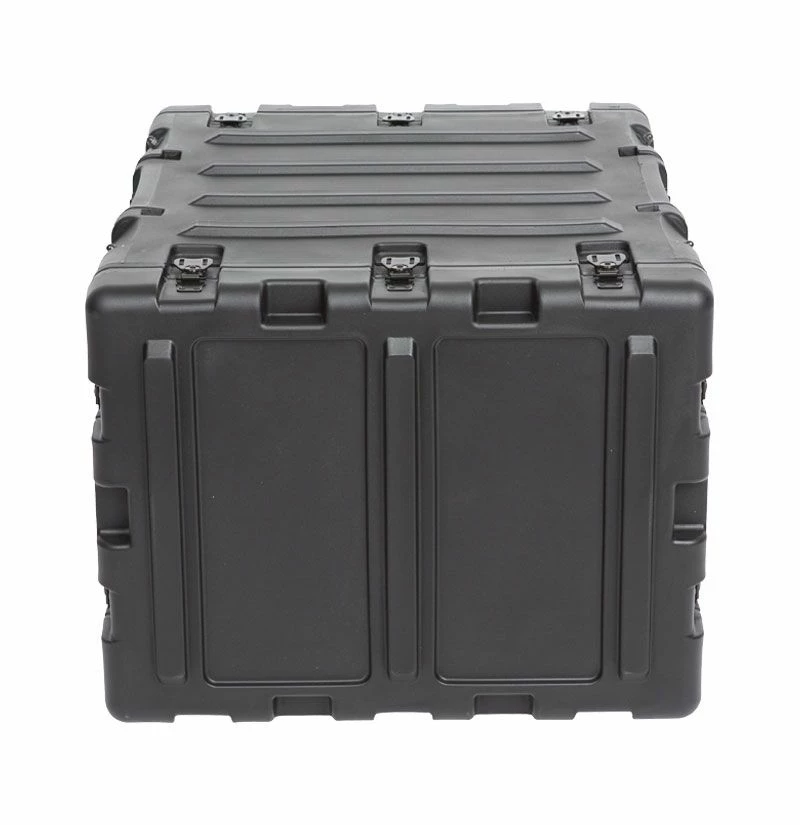 The rugged roto-molded shell ensures industry leading strength and impact resistance. The standard commercial off the shelf (COTS) case comes with 2 in. deep front and rear lids to accommodate rack gear that is longer than 20 inches. Molded-in stacking ribs and lugs are designed to stack with all SKB 3RR and 3RS cases, as well as competitive manufacturer cases, and feature black powder coated stainless steel hardware that is recessed for protection and 4 comfort grip spring loaded lift handles which allow for easy movement. An automatic pressure relief valve is another standard feature along with gasket sealed lids that include convenient lid hangers to store your lids when your equipment is in operation. Coupling straps are included for securing the racks together when stacked.