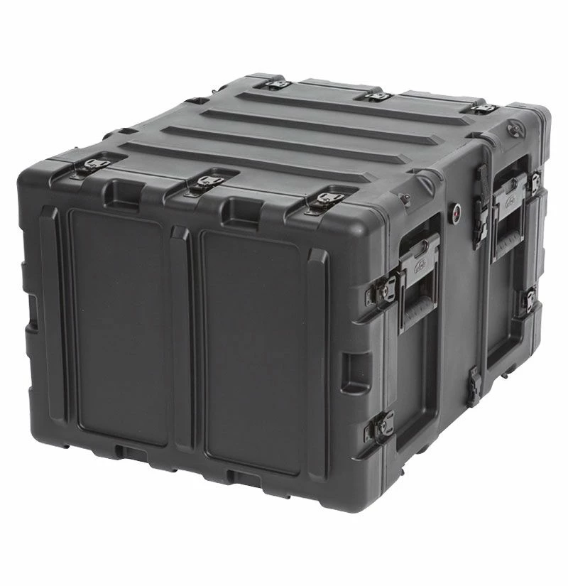 SKB’s 3RS Series Static Shock Rack Cases are lightweight, shockproof, watertight, dustproof, heat and chemical resistant, perfect for protecting and transporting your sensitive electronic equipment. The inner rack chassis is built of high strength (but lightweight) aluminum alloy extrusions with 11 gauge hot rolled carbon steel rack rails to meet EIA-310 standards. Shock and vibration mitigation is accomplished with eight (8) elastomeric isolators rated for a payload range of 40 lbs to 150 lbs in a standard configuration (optional extended payload range of 160 lbs to 300 lbs can be accommodated as a special order option). The interior frame and shocks provide adequate sway for ambient air circulation and heat dissipation.
