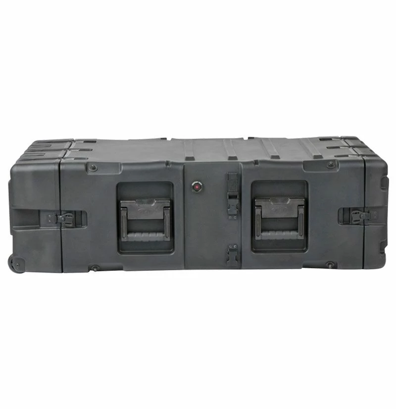 The rugged roto-molded shell ensures industry leading strength and impact resistance. The standard commercial off the shelf (COTS) case comes with 2 in. deep front and 5 in. rear lids to accommodate rack gear that is longer than 24 inches, and edge casters to allow convenient cast transport. Molded-in stacking ribs and lugs are designed to stack with all SKB 3RR and 3RS cases, as well as competitive manufacturer cases, and feature black powder coated stainless steel hardware that is recessed for protection and 4 comfort grip spring loaded lift handles which allow for easy movement. An automatic pressure relief valve is another standard feature along with gasket sealed lids that include convenient lid hangers to store your lids when your equipment is in operation. Coupling straps are included for securing the racks together when stacked.