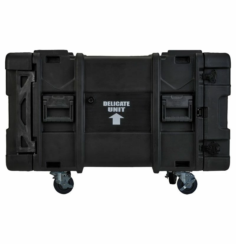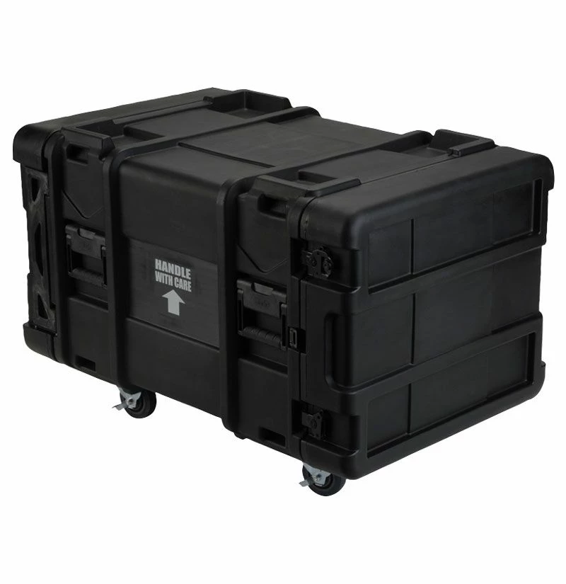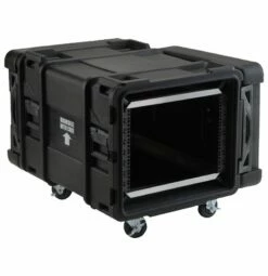 - 28 in. Deep 8U ATA rated roto-molded shock and water resistant rack with 4 in. wheels