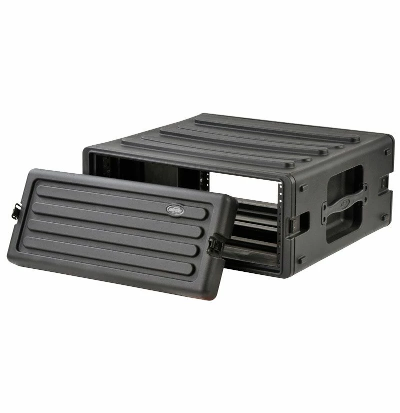 SKB Roto Racks represent the ultimate in American technology with their roto-molded tough shells, front and rear lids, recessed heavy-duty twist latches, molded in handles, and shock absorbing rubber feet for solid stackability. The unique molded-in unbendable valance and steel threaded rails with self tapping screws make the SKB Roto Racks durable and convenient to use.
