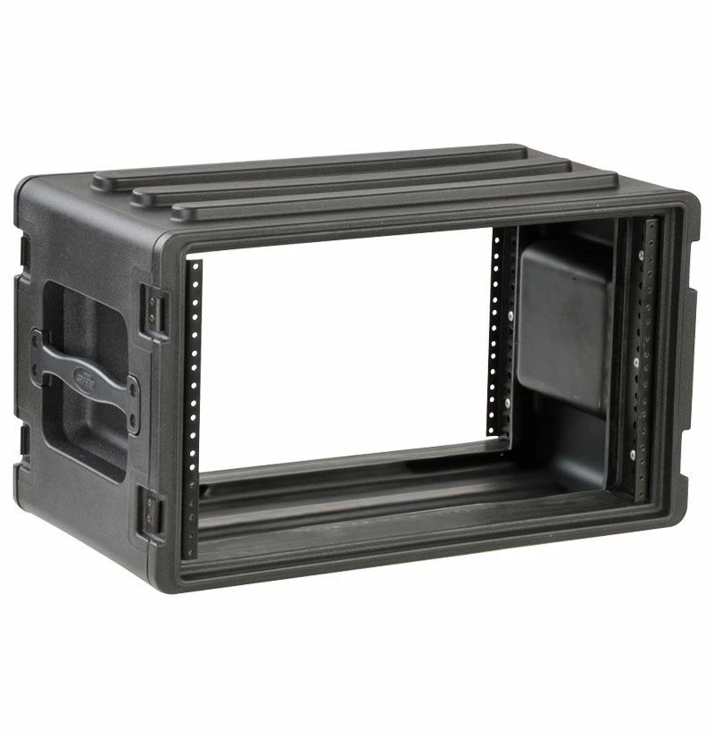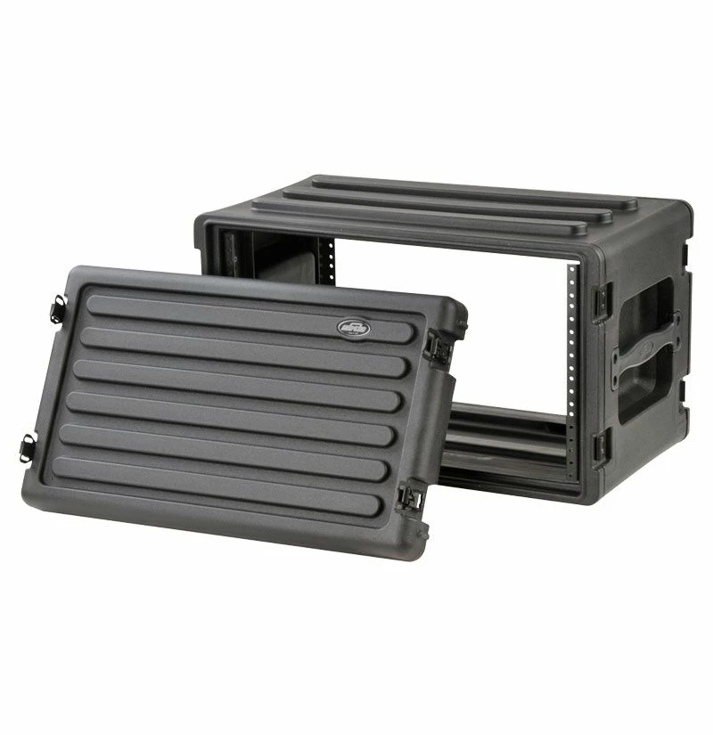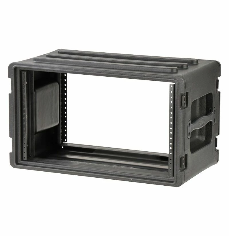 The Shallow Racks are roto-molded for strength and durability and feature a new exterior design with interlocking capabilities, recessed steel, Mil-Spec black twist latches, shock absorbing rubber feet and new heavy-duty flush handles. With the addition of rear rack rails and the new cover design, the depth on the new Roto–molded Shallow Racks has been extended to 10.7 in. from front to rear rail. Gear can now be mounted front and rear with the supplied rackmount clips.
