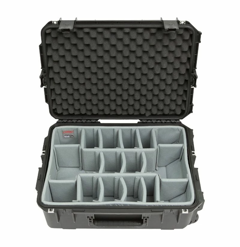 The 3i-2215-8DT is watertight and dustproof, and features a deluxe closed cell fitted foam liner, (2) heavy duty hinged dividers, and (13) closed cell foam pads, all of which are Nylex-wrapped and designed with heavy duty hook-and-loop tabs to create the perfect fit. This case also features built-in wheels and a convenient pull handle for easy transport.