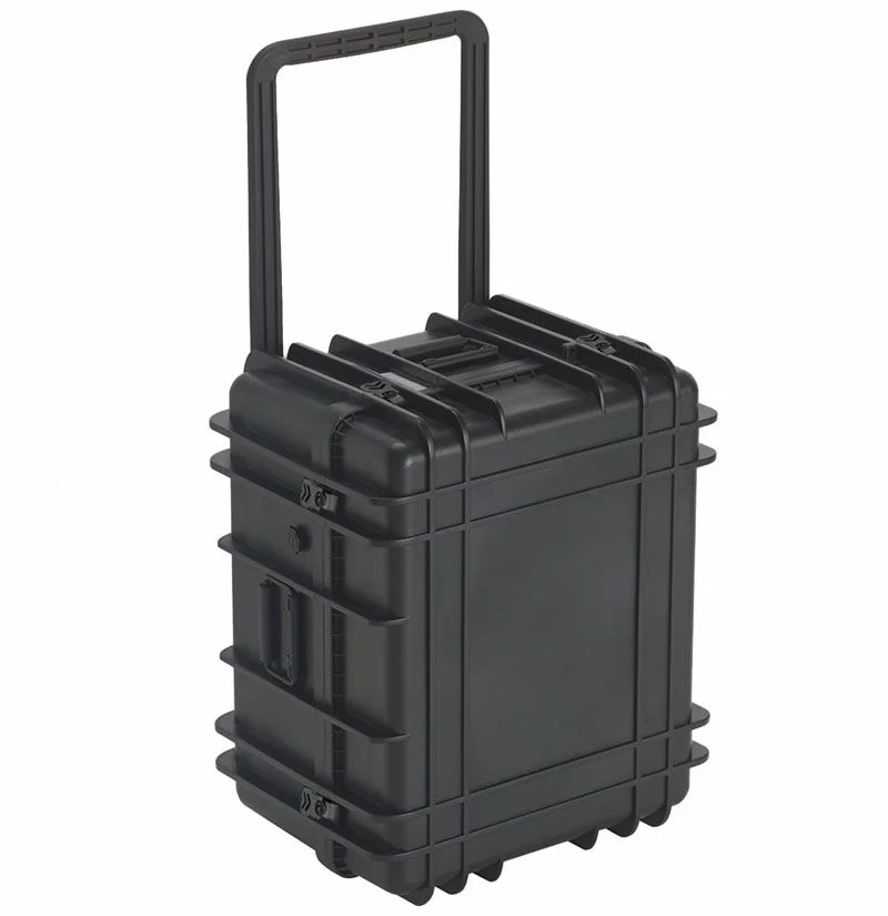 Tough injection-molded wheeled case is designed with rigid reinforced walls to give maximum protection for even the most sensitive equipment. The extendable handle and 2 in. wheels make maneuvering with heavy loads easy. The case features three metal spring-loaded handles and stainless steel twist-lock latches. A waterproof, dustproof O-ring seal protects valuable contents including instrumentation, sales presentation packages, test equipment, photographic equipment, and other delicate items.