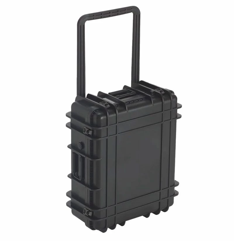 Tough injection-molded wheeled case is designed with rigid reinforced walls to give maximum protection for even the most sensitive equipment. The extendable handle and 2 in. wheels make maneuvering with heavy loads easy. The case features three metal spring-loaded handles and stainless steel twist-lock latches. A waterproof, dustproof O-ring seal protects valuable contents including instrumentation, sales presentation packages, test equipment, photographic equipment, and other delicate items.